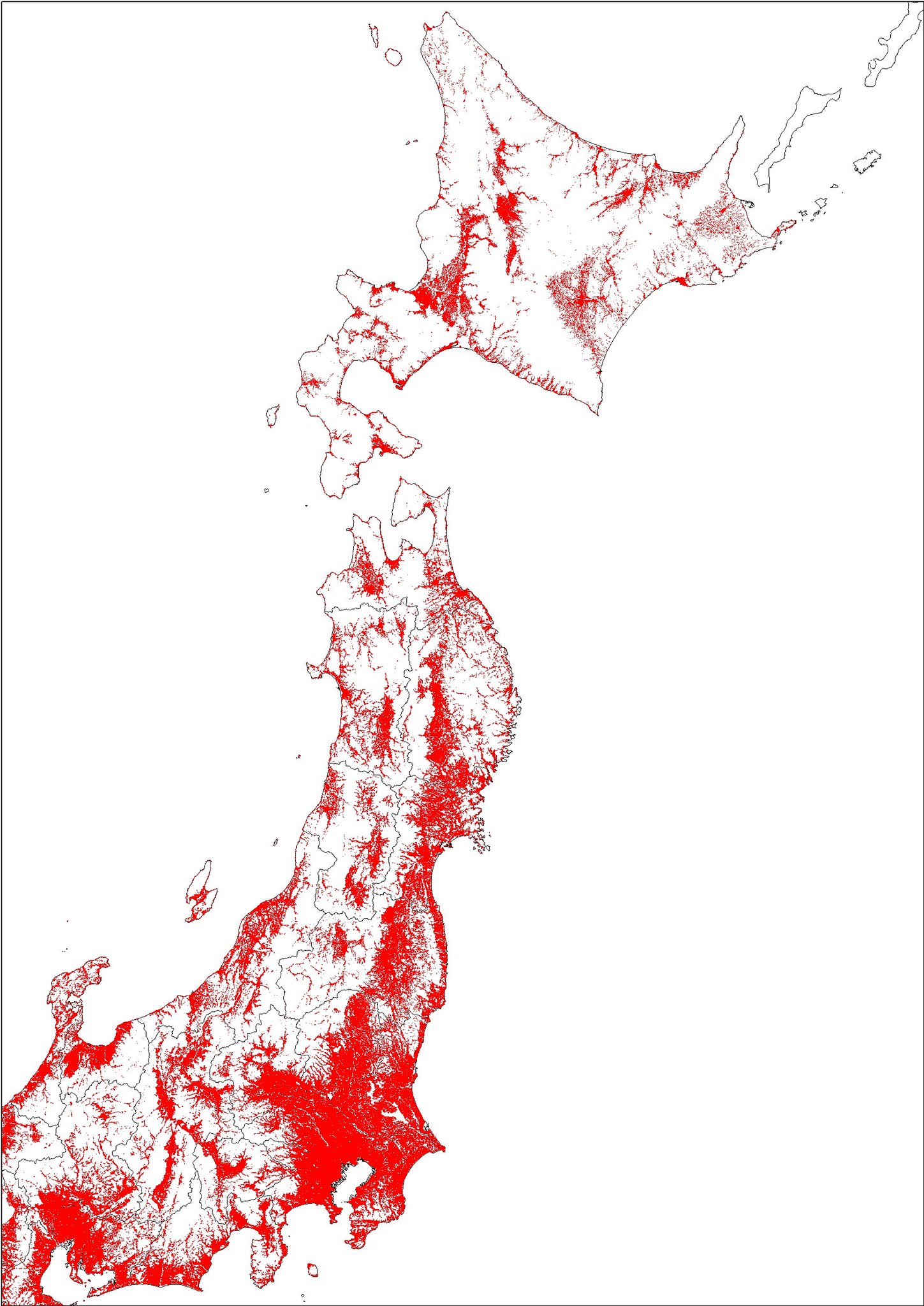 m 小林 on twitter 1日1地図 この浮かび上がる日本地図 何かわかりますか これは人が住んでいる場所 250mメッシュ だけ着色した日本地図で すなわち白いところには人が住んでいません 北海道の人口密度の低さ 東京の人の多さ 中国地方の満遍なく人がいる